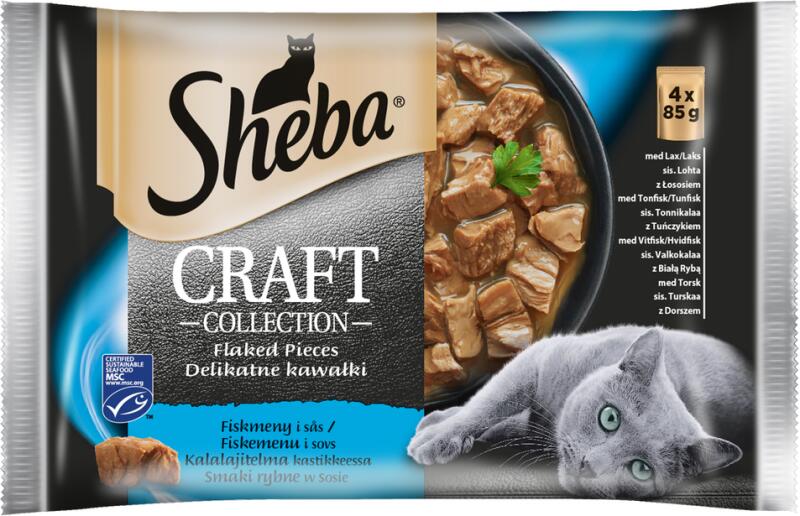 Sheba Sachet Craft Collection Hal ízek 4x85g - Termékleírás A SHEBA Craft Collection Fish Flavours in Sauce mesterien elkészített, kiváló minőségű teljes értékű nedves eledelt tartalmaz kedvence számára. Ez a különleges Craft Collection termékcsalád egyik terméke. A húsos darabok bársonyos mártásban lévő fényűző keveréke még a legigényesebb macska ízlését is elk