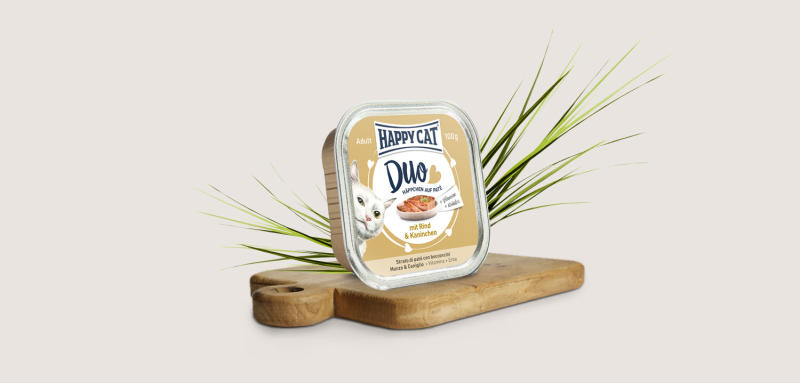 Marhával és nyúllal. Adalékanyagok nélkül. Mert lakmározni öröm. Ezért a Happy Cat egy új ízletes és kiegyensúlyozott nedves eledelt kínál, a Happy Cat Duo menüt, amely a macskát egészséges összetevőkkel kényezteti. Választékunkat tovább bővítettük egy egyedülálló receptúrával: finom falatok ízletes pástétomon. Happy Cat nedves eledeleinket 6 ízben kínáljuk,
