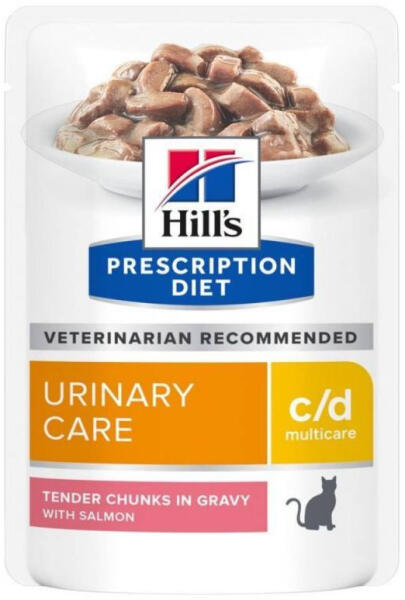 Hill's Prescription Diet c/d Multicare Urinary Care lazac alutasakos 12*85g Diétás nedvestáp felnőtt macskák számára, a struvitkövek feloldására, a struvitkövek kiújulásának és az oxalátkő-képződés csökkentésére, vizeletlúgosító hatású, alacsony magnézium- és kalciumtartalom. Összetétele vizeletlúgosító tulajdonságokkal bír, valamint alacsony magnézium-, kalci