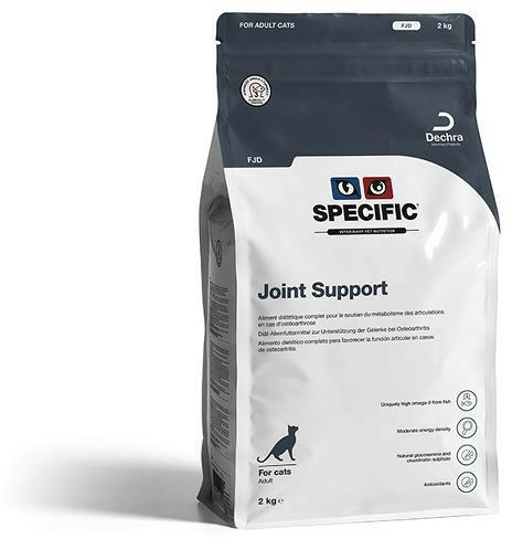A Specific FJD Joint Support egy teljes értékű és kiegyensúlyozott állateledel felnőtt és idős macskák számára ízületi funkciók segítésére ízületi gyulladás (ostheoarthritis) esetén. Jellemzők : – Magas omega-3- zsírsavakat tartalmazó halolajból, és csökkent energiatartalmú. – Fedezi felnőtt és idős macskák tápanyagszükségleteit és hozzájárul az egészsé