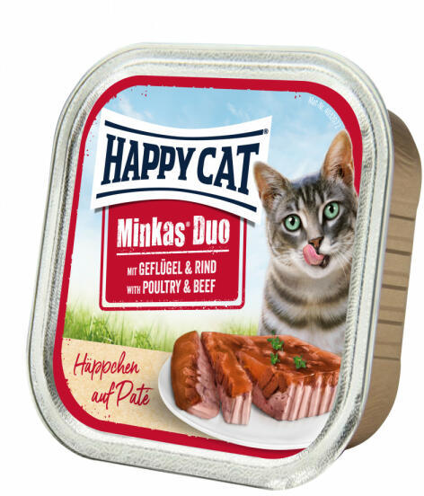 Teljes értékű táplálék felnőtt macskáknak Duo Paté formájában, ízletes pástétom marhahússal és baromfival. A Happy Cat Duo Paté nedves eledel kétféle húst kínál macskájának, hogy még a legválogatósabb ízlésűek is elégedettek legyenek. finom pástétom finom baromfi és egészséges marhahús 90% állati fehérje gabonamentes k nnyen emészthető nem tartalmaz mesters