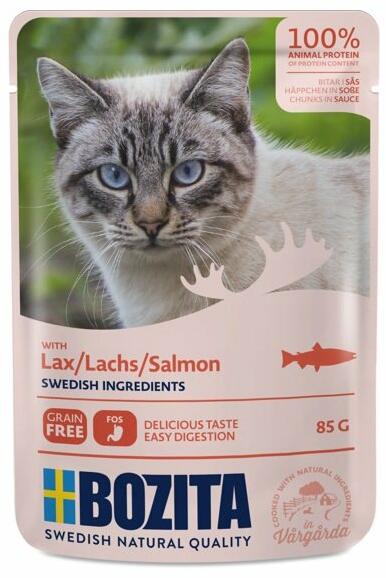 BOZITA darabok lazacmártásban 85g - Leírás A Bozita nedves eledel a macskák számára minden fejlődési szakaszban alkalmas. Minden összetevő természetes, friss és egyenesen a svéd vidékről vagy vadon élő területekről származik, aminosavakkal, vitaminokkal és ásványi anyagokkal, amelyek garantálják macskája jólétét. Lazacízű étel. Összetétel Hús és állati eredet
