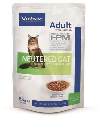 Virbac hpm cat adult neutered-salmon 12X85 g Kiváló ízletességű, teljes értékű nedves eledel ivartalanított felnőtt macskáknak, 12 hónapos kortól. LEÍRÁS ÖSSZETÉTEL: Hús és állati származékok, hal és halszármazékok (lazac 4,7%), növényi eredetű származékok, tojás és tojásszármazékok, növényi fehérjekivonatok, olajok és zsírok, ásványi anyagok, különféle