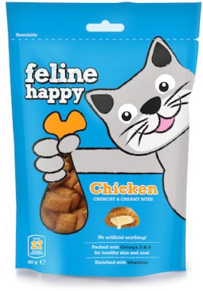 A Feline Happy csirkés gourmet falatkái tápláló és egészséges összetevőkből készülnek. Nem tartalmaznak hozzáadott mesterséges színezéket, tartósítószereket, ízesítést. Minden falatnak ropogós külseje és krémes belseje van. Támogatja az immunrendszert, ápolja a fogakat és erősíti a csontokat. Prebiotikus rostokat is tartalmaz, melyek az egészséges emésztésért f