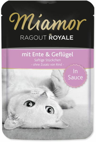 Miamor Cat Ragout zsebkacsa+baromfi zsebes lében 100g, teljes értékű eledel felnőtt macskák számára. finom darabok finom lében, ínyenc étel kacsa- és baromfihússal - teljesen marhahús nélkül. Vitaminokkal dúsítva. Színezék- és tartósítószermentes. adagolási utasítások: 4 kg-os macskáknak naponta körülbelül 3 kapszulát adjon. összetevők: hús és állati termékek
