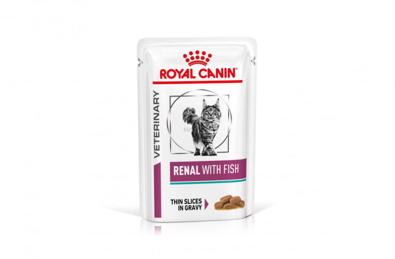 A Royal Canin Renal with Fish thin slices in gravy, vékony szeletek pecsenyelében hallal, nedves állateledel komplett diétás macskaeledel, amely krónikus veseelégtelenség esetén támogatja a veseműködést, korlátozott mennyiségű foszfor- és csökkentett, de kiváló minőségű fehérjetartalmának köszönhetően. A Royal Canin Renal with Fish thin slices in gravy, vékony szeletek