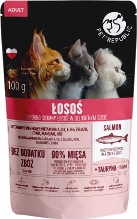 Lazac, finomra vágott (felaprított) darabok finom mártásban, 100g. Finomra vágott lazacdarabkák minden fajta macskának, finom mártásban tálalva, amely meghívást jelent egy ízletes étkezésre. 90% hús és állati eredetű termék a darabban!NINCS ZÖRZSÉG ÉS CUKOR hozzáadásával, hozzáadott vitaminokkal és ásványi anyagokkal. A-vitaminnal: a megfelelő szemműködésért D3-v