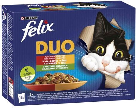 9.18kg Felix Fantastic Duo alutasakos macskaeledel, puha húsos falatok aszpikban, multipack/kartonos kiszerelésben (12 x 85 g). Kiegyensúlyozott teljes értékű állateledel felnőtt macskák számára. A macskatáp minőségi összetevőkből készül mesterséges színezékek és tartósítószerek hozzáadása nélkül. A finom, aszpikban mártózó falatok nagyon étvágygerjesztően nézn
