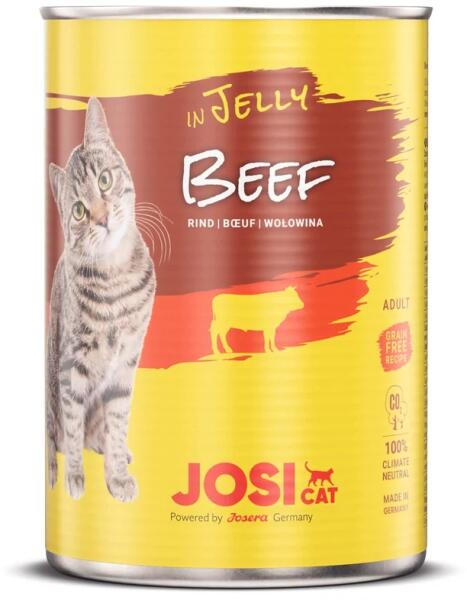 JOSICAT - MARHA ASZPIKBAN A JosiCat Beef in Jelly prémium minőségű nedves eledel felnőtt macskák részére. A kiváló íznek köszönhetően a macskák szívesen fogyasztják. Az aszpikban lévő marhahús falatok fantasztikus ízélményt nyújtanak. Gabonamentes eledel, mesterséges adalékok nélkül. Az E-vitamin védi a sejteket a káros szabad gyököktől, míg a D3-vitamin segít me