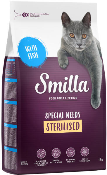 A zooplus. hu kínálatából: A Smilla Adult Sterilised olyan száraztáp, amelyet speciálisan ivartalanított macskák anyagcseréjéhez igazítva fejlesztettek ki. Az ivartalanított macskák étvágya jócskán megnövekszik, viszont ezzel egyidejűleg energiaigényük csökken. Megfelelő zsír- és energiatartalmával a Smilla Sterilised segíthet macskájának ideális testsúlya megtartá
