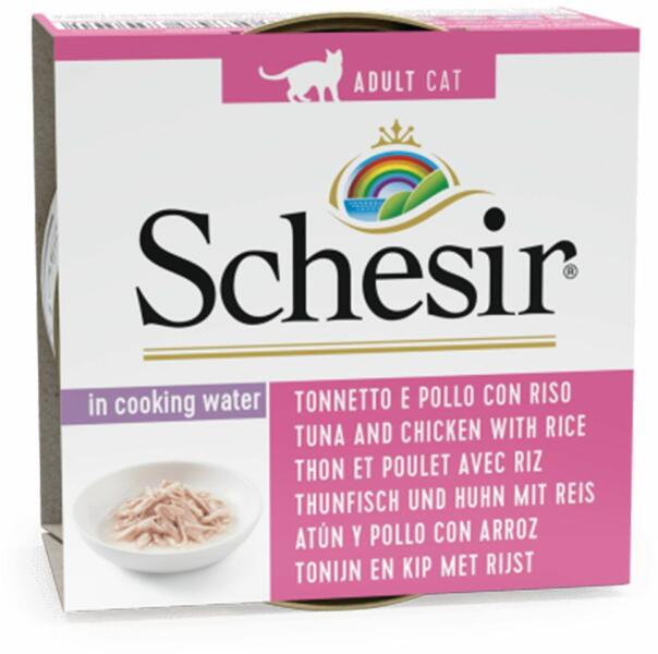 Schesir finom konzerv eledel felnőtt macskák számára, tonhallal, csirkével és rizzsel alaplében. a legjobb tonhaldarabok csont, belsőség és bőr nélkül. a konzerv nyílt tengeren fogott halat, nem pedig tenyésztett halat tartalmaz a könnyen emészthető csirke minimális zsír és koleszterin tartalommal a macska számára szükséges összes aminosavat és fehérjét tartalmazza a h