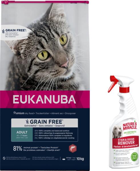 Eukanuba Cat Gabonamentes felnőtt lazac 10kg EUKANUBA Gabonamentes szárazeledel felnőtt macskáknak, lazacban gazdag 10kgAz EUKANUBA szárazeledelek 100%-ban teljes értékűek és kiegyensúlyozottak, és tartalmazzák a macska egészségének megőrzéséhez szükséges összes alapvető tápanyagot. A száraztáp egyik fő előnye a ropogós darabok. Gabonamentes alternatíva speciális táp