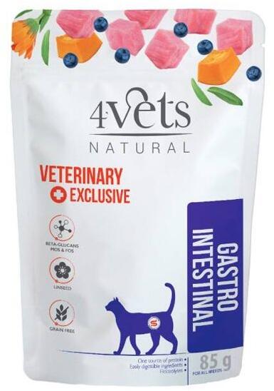 A4Vets Natural teljes értékű, gabonamentes állatorvosi macskaeledel emésztőrendszeri betegségben szenvedő macskák számára. A táplálékintolerancia tünetei, emésztési zavarok, hányás, hasmenés mind a vékony-, mind a vastagbélből adódóan fontos a könnyen emészthető, megfelelő mennyiségű, jó minőségű fehérjét és zsírt tartalmazó táplálékon alapuló táplálko