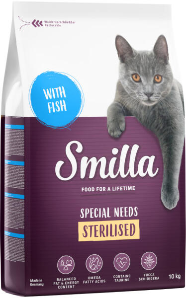 A zooplus. hu kínálatából: A Smilla Adult Sterilised olyan száraztáp, amelyet speciálisan ivartalanított macskák anyagcseréjéhez igazítva fejlesztettek ki. Az ivartalanított macskák étvágya jócskán megnövekszik, viszont ezzel egyidejűleg energiaigényük csökken. Megfelelő zsír- és energiatartalmával a Smilla Sterilised segíthet macskájának ideális testsúlya megtartá