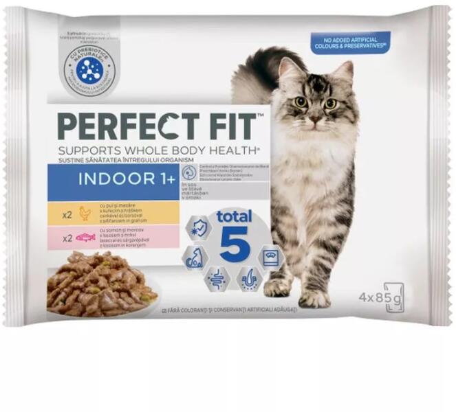 PERFECT FIT Indoor alutasakos macskaeledel lazaccal és zöldséggel 4 x 85g Minden ízletes PERFECT FIT recept egyedi formulát tartalmaz, melyet a Waltham Petcare Science Institute állatorvosaival és táplálkozási tanácsadóival közösen fejlesztettünk ki. A PERFECT FIT támogatja macskája egész testének egészségét annak érdekében, hogy macskája minden nap a legjobb egyéniségé