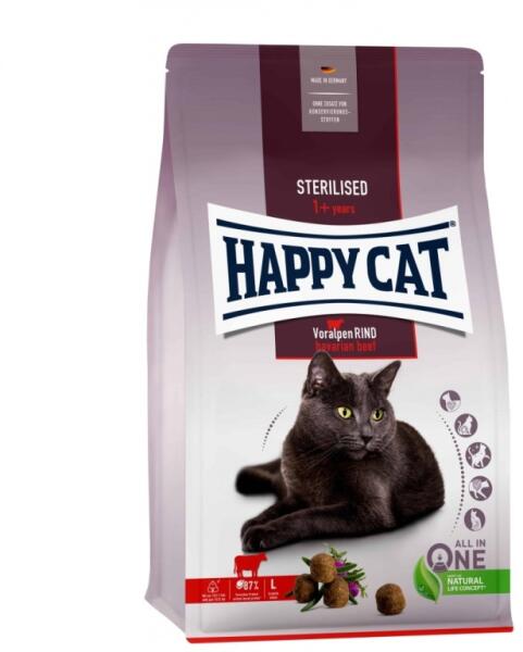 A Happy Cat Sterilised Voralpen-Rind (alpesi marha) kifejezetten az ivartalanított macskák számára lett kifejlesztve. A finom, telített, magas rosttartalmú eledelek csak 10,5% zsírt tartalmaznak, azonban értékes fehérjében is gazdag az alpesi marha és a finom baromfi miatt. A finom receptúra hal nélkül készül. Az új ALL IN ONE koncepciónak köszönhetően ebben az ízben is megt