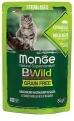 Monge Cat BWild Grain Free Sterilised lazac, garnéla és zöldségek - teljes értékű, gabonamentes, szószos nedvestáp ivartalanított macskák számára, lazaccal, garnélával és különféle zöldségekkel.
