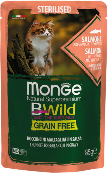 A Monge Natural Super Premium Bwild gabona nélküli, sterilizált macska lazac garnélával és zöldségekkel (zöldbab és sárgarépa) teljes értékű és kiegyensúlyozott táplálék sterilizált felnőtt macskák számára. A sterilizált macskák jólétét szem előtt tartva, a megnövekedett rostbevitelnek és csökkentett zsírbevitelnek köszönhetően elősegíti a karcsú fizikai á