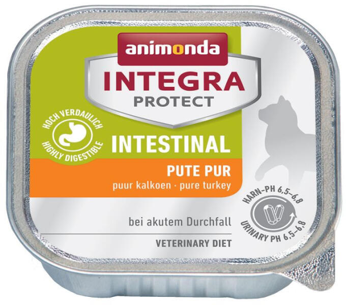 Animonda Integra Protect Intestinal Pulyka – Érzékeny emésztőrendszerű vagy válogatós macskák részére, valamint emésztőszervi eredetű megbetegedések esetén adható, magas emészthetőségű, kímélő nedvestáp pulykahússal. Az Animonda Integra Protect Intestinal Pulyka etetése az ajánlott esetekben ajánlott: Hasmenés Bélgyulladás Baktériumok túlszaporodása Colitis Láb