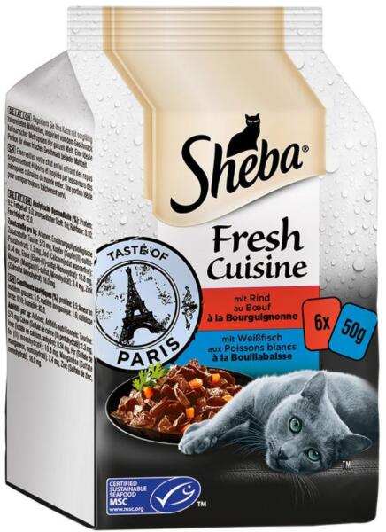 A francia főváros, Párizs gasztronómiája ihlette, s még a legigényesebb kis ínyenc cicusokat is az etetőtálhoz csalogatja. A Sheba Fresh Cuisine Taste of Paris (MSC) multipack két finom ízváltozatot tartalmaz: marhát és pontyféléket. A feldolgozott hal fenntartható halászatból származik. A táp készre adagolva, frissen tartó tasakokba csomagolt. Csupán fel kell tépnie a ta