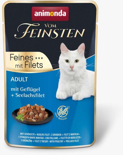 Az Animonda gabonamentes tasakos teljes értékű eledel baromfihússal és tőkehalfilével szószban, 1-6 éves felnőtt macskák számára. könnyen emészthető húst tartalmaz nagyszerű választás még a legválogatósabb macskák számára is gabona-, glutén-, búza-, szója-, mesterséges színezék- és tartósítószer-mentes összetevők : 42% hús és állati termékek (baromfi), 10%