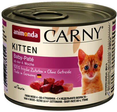 Animonda Cat Carny Baby Paté teljesértékű eledel négy hetesnél idősebb kiscicák számára. A macskák természetüknél fogva húsevők. Nem képesek megkapni a számukra szükséges tápanyagokat pusztán zöldségekből. Mindez 3500 emberekkel együtt töltött év alatt sem változott. A Carny macskaeledel kizárólag friss húsfélékből készül, mint a szív, tüdő, színhús és m