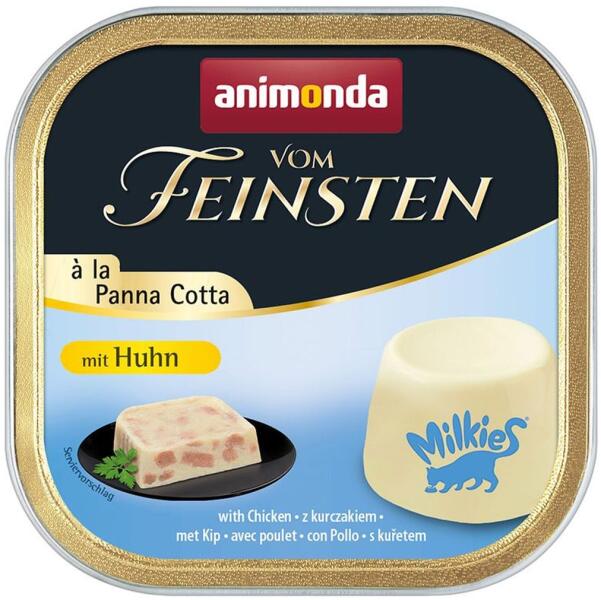 Az Animonda Vom Feinsten Adult à la Panna Cotta csirke lédús darabjait ízletes tejkocsonya borítja. A "Panna cotta" az olasz éttermekben "finom desszert" ként ismert. cukor-, gabona-, szója-, mesterséges színezék- és tartósítószer-mentes C-vitami nnal, rézzel és cinkkel kényelmes módja a közvetlenül a kádból való táplálkozásnak, csak tépje le a kupakot és máris tálal