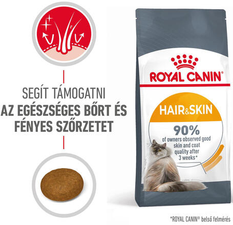 20kg A Royal Canin Hair & Skin Care célzottan a bőr egészsége és a bunda fényességeérdekében készült. Pontosan kiegyensúlyozott összetételű száraz táp felnőtt macskák számára, amely segít egészségesen tartani a bőrt és a szőrzetet. Igazolt eredmények az egészséges bőrért, a fénylő szőrzetért a Royal Canin Hair & Skin Care segítségével. 21 nap alatt eg