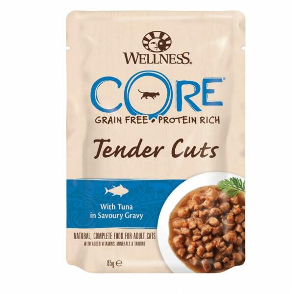 Wellness CORE Tender Cuts természetes eledel tonhalból ízletes szószban, gabonafélék nélkül felnőtt macskák számára (1 éves kortól). lassan főzött szaftos darabkák ízletes szószban egészséges zöldségekkel és gyümölcsökkel az eledel nem tartalmaz gabonaféléket, búzát, kukoricát, szójababot, tejtermékeket, tartósítószereket, mesterséges színezőanyagokat és í
