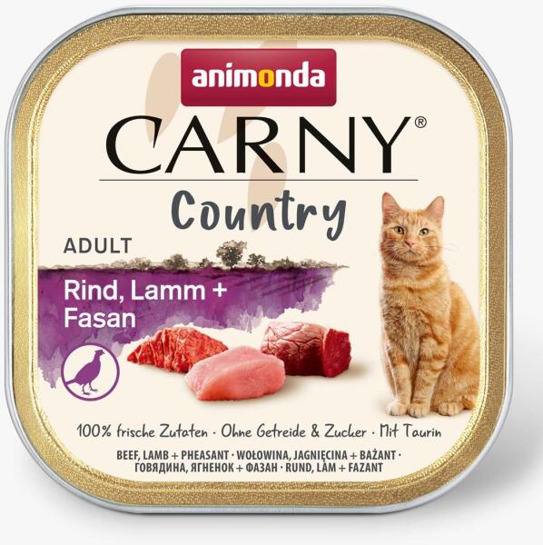 Az Animonda Country teljes értékű nedves eledel marha-, bárány- és fácánhússal, felnőtt macskák (1-6 éves korig) számára, minden fajta számára. a finom fácánhús vasat, szelént, rezet, cinket és B12-vitamint biztosít macskájának - olyan anyagokat, amelyek erősítik macskája immunitását a marhahús kiváló szelén-, vas- és rézforrás - olyan ásványi anyagok, amelyek