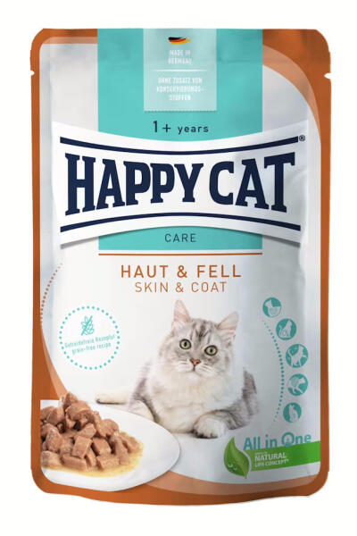 Happy Cat Meat in Sauce Care Haut & Fell Gabona nélküli recept A természetesen fényes szőrzetért Különösen ízletes Támogatja a bőrt és a szőrzetetA Happy Cat Haut & Fell finom szószban lévő baromfi ízletes receptje nem tartalmaz gabonát, viszont fontos bőraktív tápanyagokat igen, amelyek támogatják a szőrzet és a bőr természetes fényét. Az ízletes összetéte
