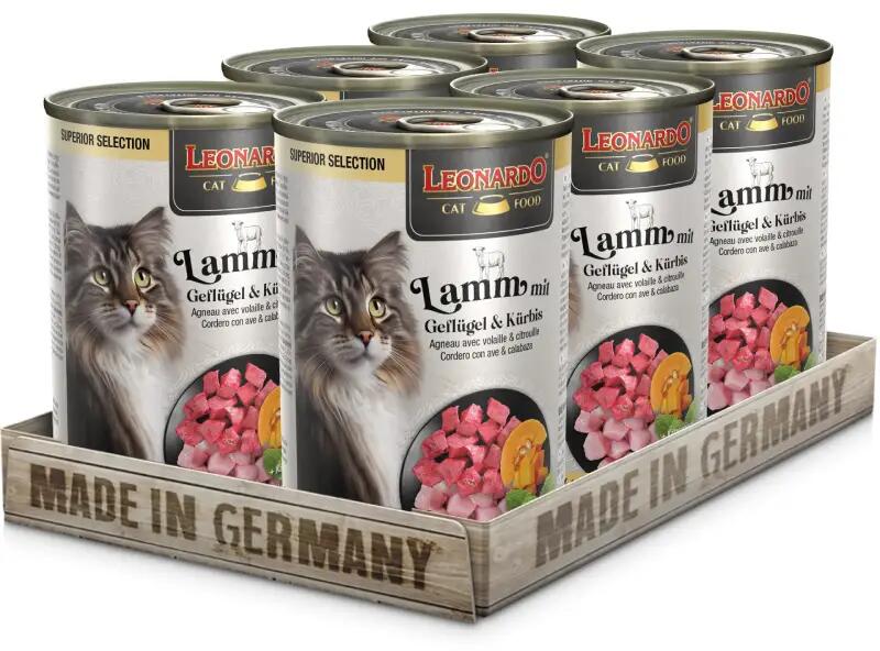 LEONARDO bárányhús baromfival és sütőtökkel Superior konzerv macskaeledel Mivel a házimacska vadon élő fajtársaihoz hasonlóan húsevő, a LEONARDO konzerveledeleinek célja a színhús-minőség nyújtása. Természetes A-és D-vitamin tartalma pedig hozzájárul az egészséges, ragyogó megjelenéshez. Az egyévesnél idősebb, kifejlett macskák részére ezen kívül még több fin