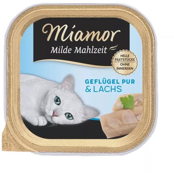 A praktikus 100 g-os tálkákban tálalt, lazaccal tálalt zsenge baromfi még a legválogatósabb dorombolóknak is ízlik. A Miamor Milde Mahlzeit eledel könnyű húsdarabokat, húslevest és zöldségeket tartalmaz, és nem tartalmaz májat, egyéb belsőségeket vagy csontelemeket. Nem adnak hozzá állati maradványokat. Az eledel gyomorkímélő és nagyon könnyen emészthető, csökkentet