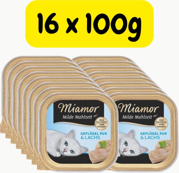 A praktikus 100 g-os tálkákban tálalt, lazaccal tálalt zsenge baromfi még a legválogatósabb dorombolóknak is ízlik. A Miamor Milde Mahlzeit eledel könnyű húsdarabokat, húslevest és zöldségeket tartalmaz, és nem tartalmaz májat, egyéb belsőségeket vagy csontelemeket. Nem adnak hozzá állati maradványokat. Az eledel gyomorkímélő és nagyon könnyen emészthető, csökkentet