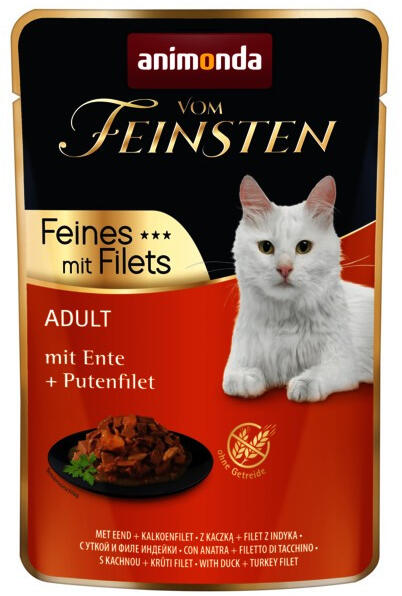 A Vom Feinsten Adult Feines mit Filet a kiegyensúlyozott, ízletes, egészséges táplálkozást jelenti a legmagasabb szinten 1-6 éves felnőtt macskák számára. A zsenge darabok húsos hozzávalóinak minősége finom szósszal és a legfinomabb filédarabokkal kombinálva egyedülálló élvezetet garantál. A finom, ínyenc ragu a felnőtt macskákat minden alapvető tápanyaggal ellátja.