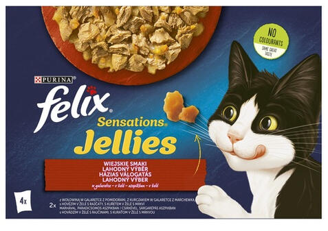 FELIX SENSATIONS JELLIES Házias válogatás aszpikban nedves macskaeledel 4x85g Összetétel: Hús és állati származékok* (14%, melyből marha 4%), Növényi fehérjekivonatok, Hal és halszármazékok, Zöldségek (0,9% dehidratált paradicsom, egyenértékű 11% paradicsommal az aszpikban), Ásványi anyagok, Különféle cukrok. *falatok: 44% hús és állati származék. Összetétel: Hú
