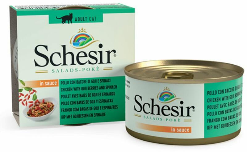 Schesir finom konzerv felnőtt macskák számára, csirkével tele, gojival és spenóttal szószban. pörkölt és kézműves legjobb csirkerészek finom gyümölcs és zöldségdarabkákkal dúsítva szószban a könnyen emészthető csirke minimális zsírral és koleszterinnel a macska számára szükséges összes aminosavat és fehérjét tartalmazza spenót hozzáadásával a nagy folsav
