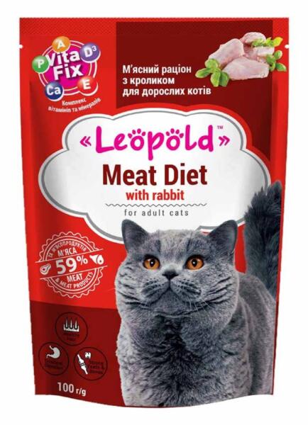 Húsos eledel nyúllal macskáknak 100g. Összetétel:(hús és húskészítmények legalább 59%-a), rizs, sütőtök, nyomelemek és vitaminok. Nem tartalmaz szóját, tartósítószert, csalogatóanyagot, aromát, színezéket, ízfokozót vagy sót. Kalóriatartalom: 115 kcal/100 gTápérték:Nyersfehérje - 12,1%;Nyers zsír - 5,0%;Nyers hamu - 2,1%;Nyersrost - 0,23%;Kalcium - 0,25%;Nedvessé