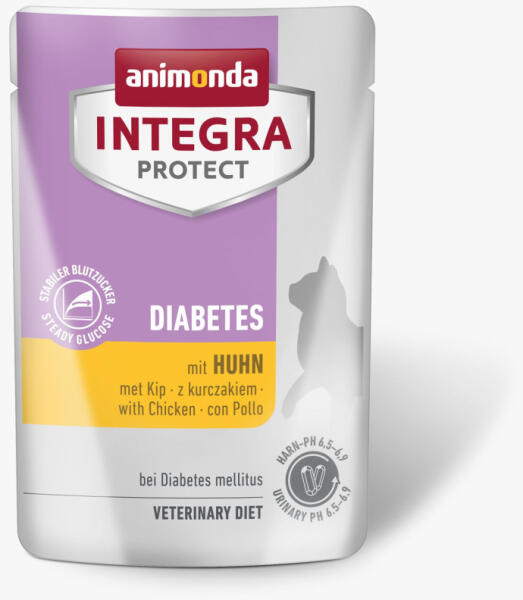 Diétás nedves eledel cukorbeteg macskáknak (Diabetes mellitus), hozzáadott cukor és keményítő nélkül, fehérjében és húsban gazdag receptúra, magas befogadóképesség, kiegyensúlyozott ásványianyag-tartalom, kevesebb szénhidrát. Ha macskája cukorbetegségben szenved, szükség lehet speciális diétás táplálék használatára. Erre a célra készült az Animonda Integra Pro
