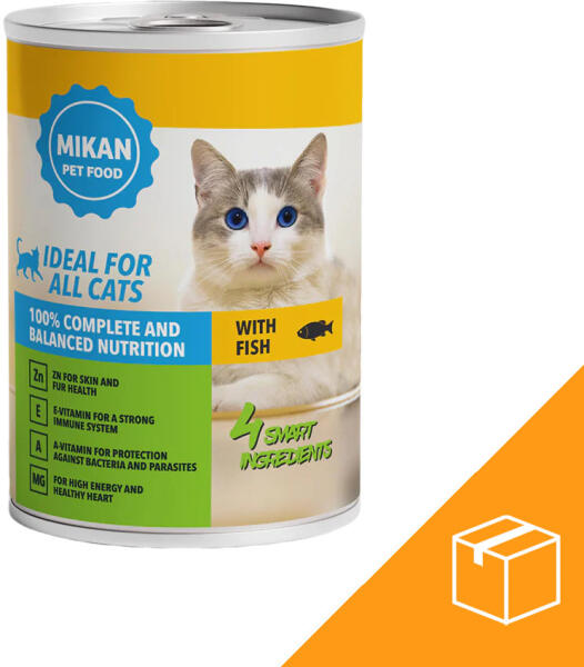 Mikan Cat Can Fish Zn a bőr és a szőrzet egészségéért E-Vitamin az erős immunrendszerért A-vitamin a baktériumok és paraziták elleni védelemért Mg a magas energiáért és az egészséges szívértA Mikan Cat Can Fish ideális minden macska számára. 100 %-ban teljes értékű és kiegyensúlyozott táplálék. Összetevők:Állati eredetű hús és húskészítmények (4% halhús),
