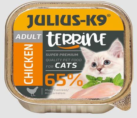 Julius-K9 Cat Terrine Adult Chicken - nedveseledel (csirke) felnőtt macskák részére (100g) Teljes értékű eledel felnőtt macskák számára. Összetétel: Hús és hússzármazékok 65% (20% csirke) zsírok, olajok (0,2% napraforgó olaj) ásványok 1%. Analitikai összetevők: Nyers Fehérje:10,30%, Zsírok, olajok: 6,50%, Nyers hamu: 2,50%, Nyers rost: 0,50%, Nedvesség: 78,00%