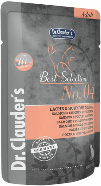 A Best Selection No 04 Lazac és Csirke quinoaval további jellemzői: 97,6% hústartalom, melyből 66,1% csirke, 30,6% lazac a lazacolaj támogatja a bőrt és szőrzetet a cink nélkülözhetetlen nyomelem, amely segíti a regenerációt és a sebgyógyulást a quinoa kilenc alapvető fontosságú aminosavat biztosít magas fehérje tartalma miatt természetes taurinban gazdag. gabonamentes nem