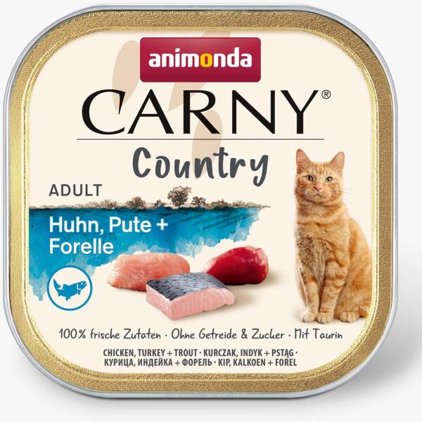 Az Animonda Country egy teljes értékű nedves eledel csirkével, pulykával és pisztránggal, felnőtt macskák (1-6 éves korig) számára, minden fajta számára. a pulykahús magas tápértékkel rendelkezik, viszonylag alacsony kalóriatartalmú és tápláló, valamint kiváló lizin-, triptofán-, metionin- és cisztinforrás. a pisztráng az omega-3 és -6 zsírsavakkal elősegíti az eg