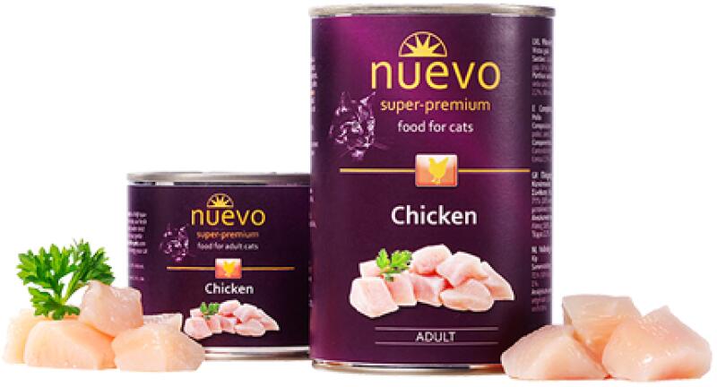 Nuevo cat adult Chicken cons. 400g, A Nuevo cat felnőtt Csirke konzerv eledel minden válogatós macskának örömet okoz, és felejthetetlen ínyencélményt nyújt számára. A nagy mennyiségű értékes fehérjét tartalmazó, magas arányú minőségi húsban (71%) gazdag konzerv a válasz az érzékeny macska egyéni igényeire - csak friss hús, létfontosságú vitaminokkal és ásványi