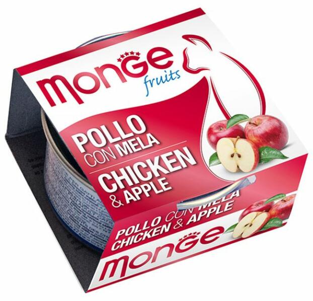 Gyártó: Monge Modell: Fruit chicken with apple 80 g Leírás: Kiegészítő eledel macskáknak csirkedarabokkal, aloe verával a gyümölcsvonalból. Omega 3 savakban és fehérjében gazdag, alacsony zsírtartalmú. A termék teljesen természetes, saját szószában, színezék- és tartósítószer-mentesen, gluténmentesen készül. Az almát nemcsak az íze, hanem a táplálkozási tulajdon