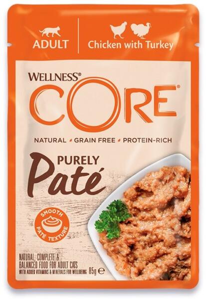 A Wellness CORE Purely Paté egy ízletes, gabonamentes csirke- és pulykapástétom felnőtt macskák számára. vitaminokkal és ásványi anyagokkal gazdagítva gabona mentes az érzékeny pocak támogatása érdekében növeli a vízbevitelt a napi hidratálás és a vizelet egészségének érdekében Fő összetevők: csirke és pulyka - kiváló minőségű fehérje- és zsírsavforrás. na