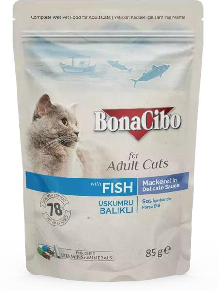 Bonacibo Pouch - Wet Adult Cat Food - Mackerel (12x85g) Makréla szószban, nedves eledel felnőtt macskák számára Termékjel lemzők Kiváló minőségű hal : A Bonacibo Pouch Mackerel nedves eledel makréla alapú, amely gazdag természetes fehérjében, és segíti a macskák egészséges növekedését. Magas fehérje- és omega-3 tartalom : A makréla szószban kiválóan táplálja a mac