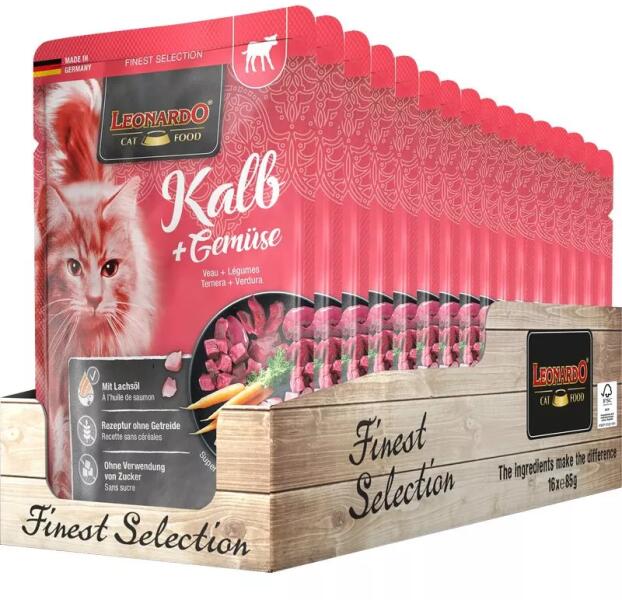 Leonardo alutasak borjúhús zöldségekkel A LEONARDO® FINEST SELECTION alutasakos macskaeledel ideális az érzékeny gyomrú és válogatós macskáknak. Szaftos húsok, finom hozzávalókkal kombinálva, melyek a Szuper Prémium nedves-eledeleknél már jól beváltak. Kevert etetésre kifejezetten alkalmas és ajánlott is a LEONARDO® Szuper Prémium szárazeledelekkel. Egészséges lazacol