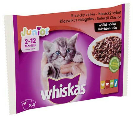 Whiskas Junior klasszikus tasakos eledel válogatás kölyök macskák számára, 4x85gMacskarajongókként tudjuk, hogy a dorombolás a legcsodásabb hang, amit csak hallhatunk. Ezért macskaséfjeink keményen dolgoznak azon, hogy olyan ízletes fogásokat készítsenek, amelyek miatt világszerte macskák milliói rohannak a tálkájukhoz izgatottan dorombolva, és elégedetten nyalogatva a baj