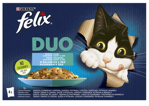 FELIX FANTASTIC DUO Halas válogatás aszpikban nedves macskaeledel 4x85g Fekete tőkehal és lazac ízletes keverékével aszpikban Összetétel: Hús és állati származékok* (12%), Növényi fehérjekivonatok, Hal és halszármazékok (fekete tőkehal 2%, lazac 2%), Ásványi anyagok, Különféle cukrok. *falatok: 40% hús és állati származék. Összetétel: Hús és állati származékok